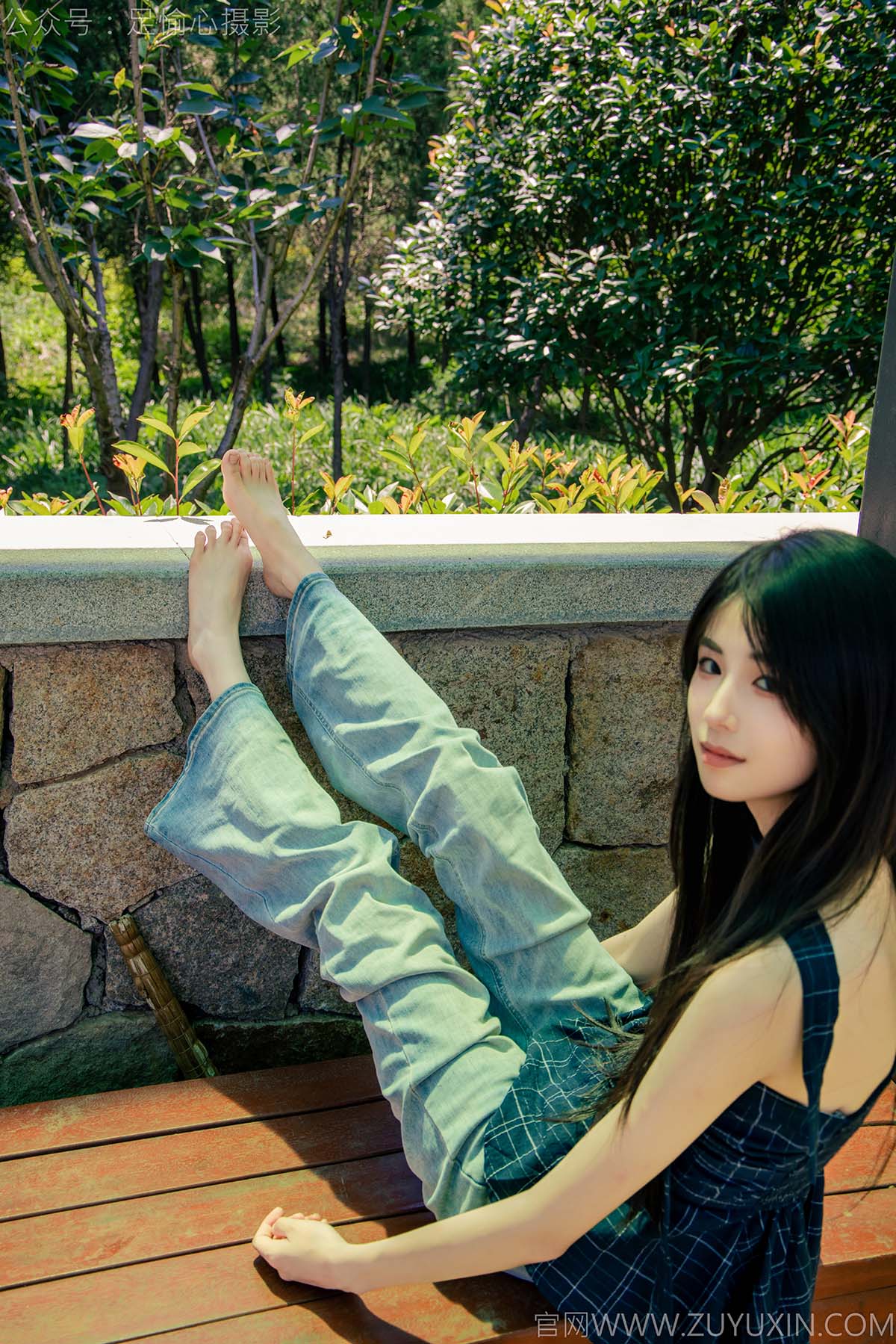足愉心 NO.049 小瑶(搭配:蓝色格子吊带、牛仔长裤、白棉袜、洞洞鞋、裸足)